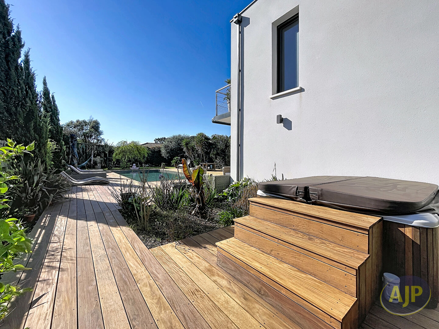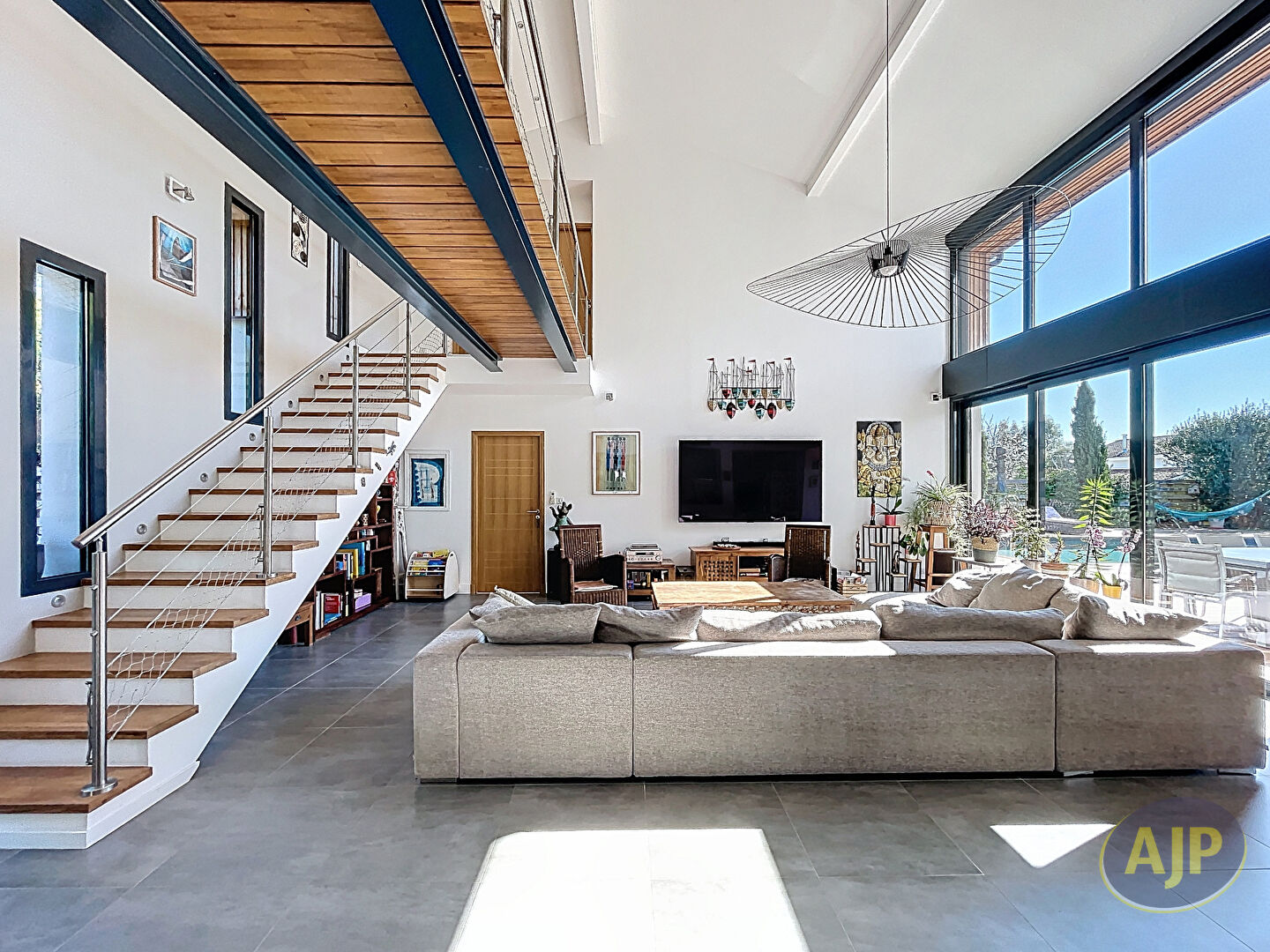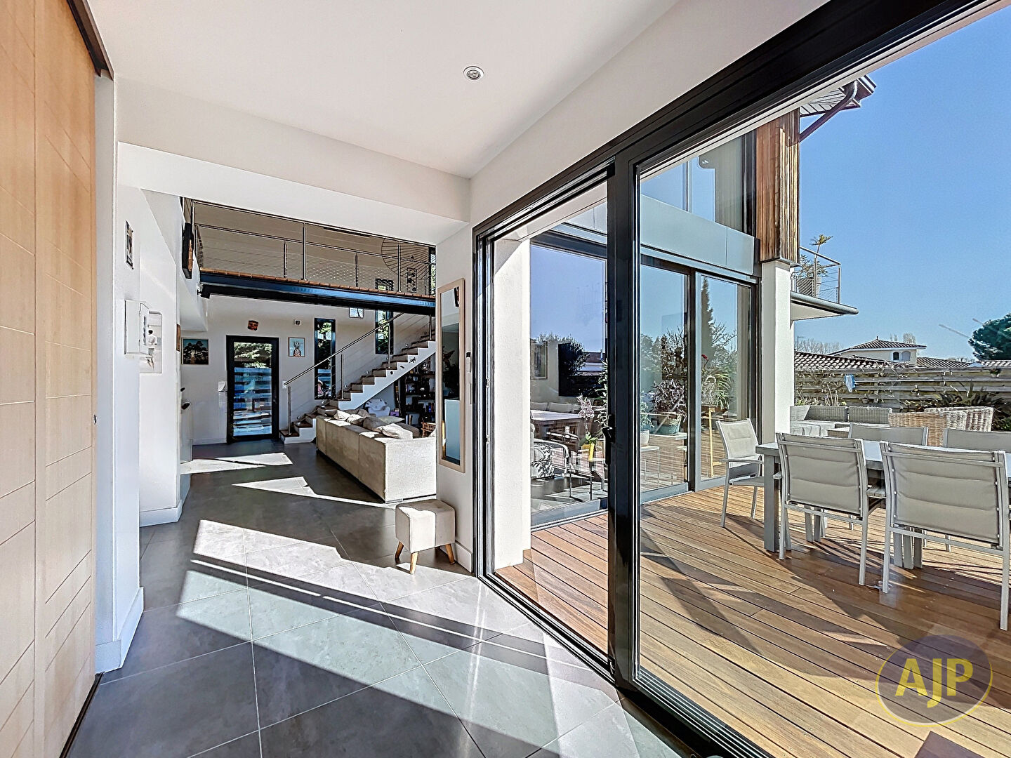 A La Teste-de-Buch, dans un environnement résidentiel particulièrement calme et préservé, cette villa contemporaine d'architecte de 2015 développe environ 220 m² habitables sur un terrain paysagé de 945 m², sans vis-à-vis. Dès l'entrée, la maison affirme une signature architecturale forte, fondée sur la générosité des volumes, la lumière omniprésente et une relation permanente avec les extérieurs.La pièce de vie, spectaculaire par sa double hauteur et ses larges ouvertures vitrées, offre un cadre de réception élégant et fluide, prolongé par de vastes terrasses en bois exotique autour d'une piscine chauffée de 5 x 12 m. La cuisine ouverte, parfaitement intégrée, conjugue lignes épurées, équipements encastrés, plan de travail en Krion et cellier attenant pour un confort d'usage au quotidien.La villa propose une organisation familiale aussi aboutie que raffinée. La suite parentale de plain-pied, avec dressing et salle de bains complète, profite d'une ouverture directe sur la terrasse et la piscine. A l'étage, trois chambres disposant chacune de leur salle d'eau privative s'articulent autour d'une passerelle au design affirmé et d'une vaste mezzanine de plus de 26 m², idéale pour un bureau, un salon TV ou un espace de détente.A l'extérieur, le jardin paysagé prolonge naturellement l'art de vivre du Bassin avec plusieurs espaces dédiés à la détente et à la convivialité : jacuzzi, terrain de pétanque, cabane pour enfants et larges surfaces engazonnées. Un double garage d'environ 44 m², des stationnements complémentaires, une pompe à chaleur, le chauffage au sol au rez-de-chaussée, la climatisation réversible, les menuiseries aluminium et l'aspiration centralisée viennent parfaire l'ensemble.Une propriété contemporaine de très belle facture, pensée pour offrir un quotidien aussi confortable qu'élégant, à quelques minutes des attraits du Bassin d'Arcachon. (5.20 % honoraires TTC à la charge de l'acquéreur.)
