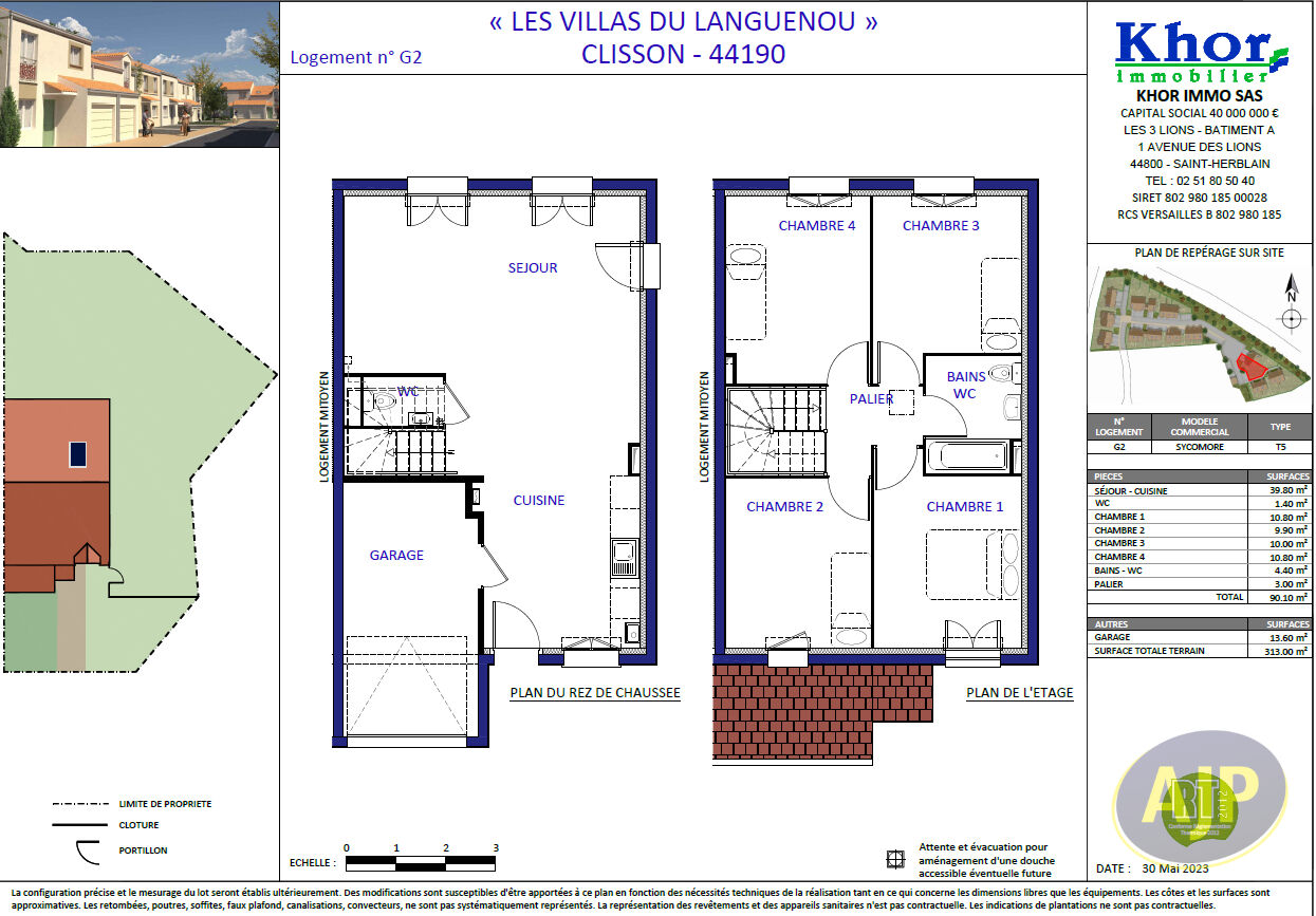 " LES VILLAS DU LANGUENOU "Villa SYCOMOREA Clisson, située à une trentaine de kilomètres de Nanteset de Cholet, Clisson est une commune dynamiquedisposant de tous les services de proximité et d'un tissuéconomique et associatif fort. L'opération "Les Villas du Languenou", accessible via la rue de Kerlan, se situe à proximité du centre, dans un secteur pavillonnaire. Vente en VEFA ( Vente en l'état futur d'achèvement), livraison prévue 3ème trimestre 2027.Elle est composée de 21 maisons de 80 à 100 m². la villa SYCOMORE d'une superficie de 90.10 m² sur 2 niveaux bénéficie au rez de chaussée d'une grande pièce de vie avec coin cuisine de 39.80 m2, d'un WC. Au 1er étage un palier dessert de 4 chambres ( 10.80 m2, 9.90 m², 10 m² et 10.80 m²) et une salle de bain avec WC de 4.40 m².Un garage de 13.60 m².Terrain de 313 m².la Maison a un jardin clos et deux places stationnements. Yves LE PAN (EI) Agent Commercial - Numéro RSAC : 2022AC00110 - NANTES.