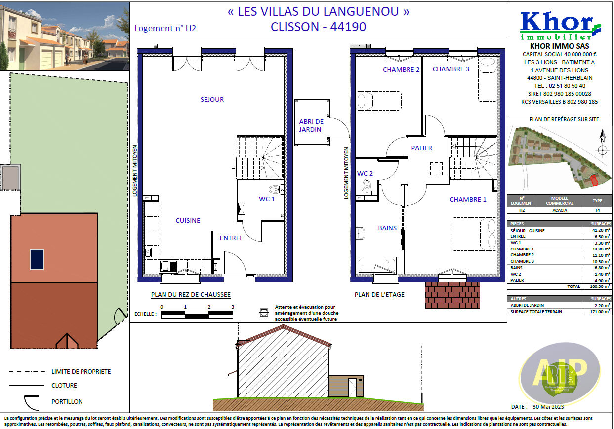 " LES VILLAS DU LANGUENOU "Villa ACACIAA Clisson, située à une trentaine de kilomètres de Nanteset de Cholet, Clisson est une commune dynamiquedisposant de tous les services de proximité et d'un tissuéconomique et associatif fort. L'opération "Les Villas du Languenou", accessible via la rue de Kerlan, se situe à proximité du centre, dans un secteur pavillonnaire. Vente en VEFA ( Vente en l'état futur d'achèvement), livraison prévue 3ème trimestre 2027.Elle est composée de 21 maisons de 80 à 100 m². La villa ACACIA d'une supercicie de 100.40 m² sur 2 niveaux bénéficie au rez de chaussée d'une grande pièce de vie avec coin cuisine de plus de 41 m2, d'un WC. Au 1er étage un palier dessert de 3 chambres ( 14.80 m2, 11.10 m² et 10.30 m²) et une salle de bain avec WC de 6.80 m².Un abri de jardin de 2.20 m²Terrain de 171 m².la Maison a un jardin clos et deux places stationnements. Yves LE PAN (EI) Agent Commercial - Numéro RSAC : 2022AC00110 - NANTES.