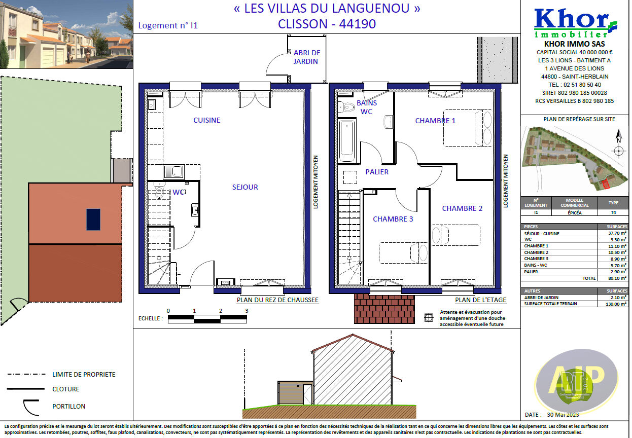 En accession à la propriété" LES VILLAS DU LANGUENOU "Villa EPICEAA Clisson, située à une trentaine de kilomètres de Nanteset de Cholet, Clisson est une commune dynamiquedisposant de tous les services de proximité et d'un tissuéconomique et associatif fort. L'opération "Les Villas du Languenou", accessible via la rue de Kerlan, se situe à proximité du centre, dans un secteur pavillonnaire. Vente en VEFA ( Vente en l'état futur d'achèvement), livraison prévue 3ème trimestre 2027.Elle est composée de 21 maisons de 80 à 100 m². La villa EPICEA d'une superficie de 80.10 m² sur 2 niveaux bénéficie au rez de chaussée d'une grande pièce de vie avec coin cuisine de 37.70 m2, d'un WC. Au 1er étage un palier dessert 3 chambres ( 11.10 m2, 10.5 m² et 8.90 m²) et une salle de bain avec WC de 5.70 m².Un abri de jardin de 2.10 m²Terrain de 130 m².la Maison a un jardin clos et deux places stationnements. Yves LE PAN (EI) Agent Commercial - Numéro RSAC : 2022AC00110 - NANTES.