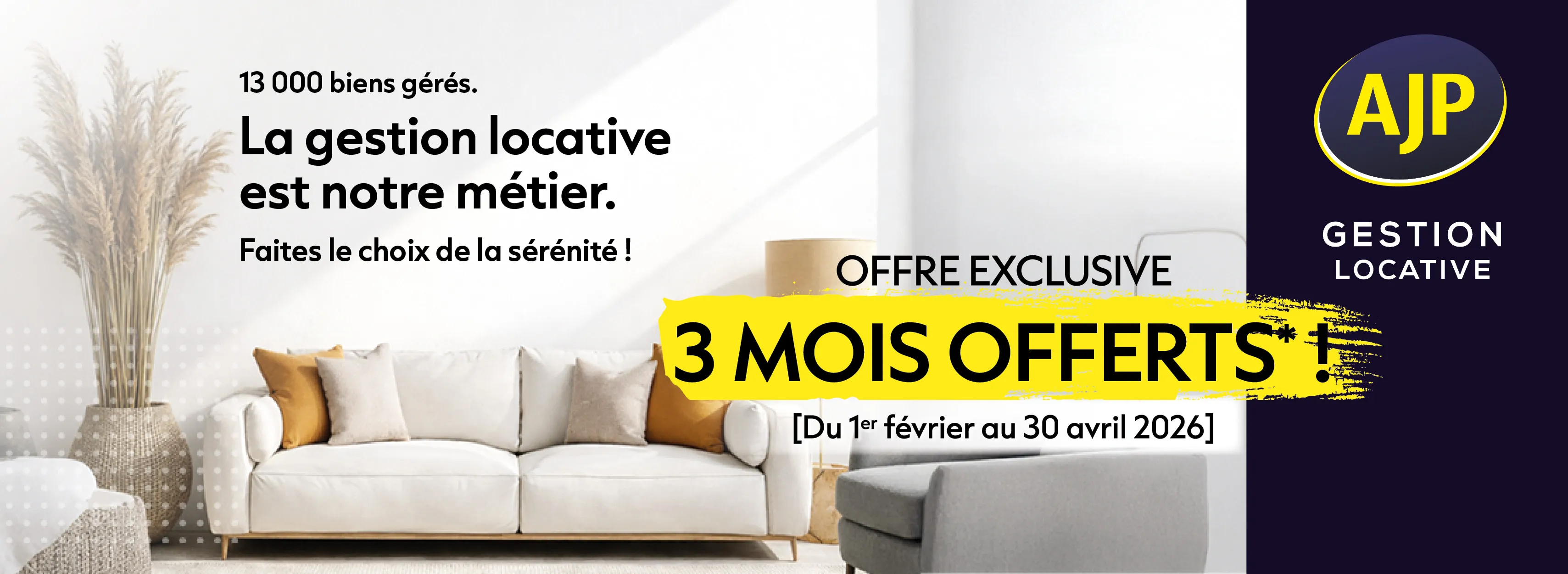 *Offre valable du 01/02/2026 au 30/04/2026 pour la signature d’un nouveau mandat (ou l’engagement de signature d’un nouveau mandat avant le 31/01/2027). Le mandat devra avoir une durée de 3 ans minimum. La gratuité s’applique sur les frais de gestion courante. Offre non cumulable avec toute autre offre en cours.